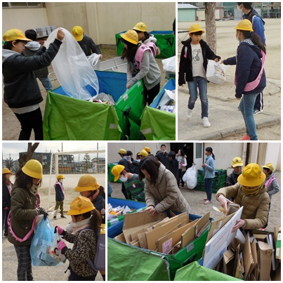 また、今日は資源回収の日でもあるので、地球を守ろう運動で回収してきたリサイクル資源や、学校で出たごみの中でリサイクルに回せるものを業者の方に持っていってもらえるように準備しました。