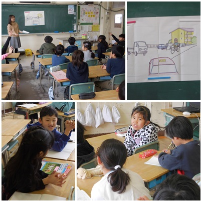 自転車に乗るときの注意について、イラストを見ながら、どんな危険があるのか、どうすれば防ぐことができるのかを話し合いました。