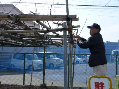 梨名人の小島さんが、梨の枝の誘引をしてくださっています。梨の枝が、上にいかないように丁寧に引っ張って、梨の棚に結びつける作業です。この作業のおかげで、収穫のときに手の届く高さで梨をもぐことができるのです。