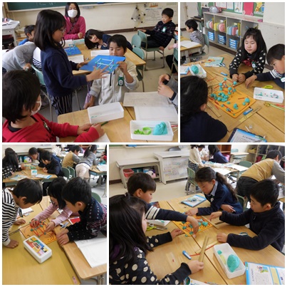 今日は、粘土とひごで立方体をつくってみて、面、辺、頂点の数を確認しています。