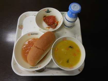 パンプキンポタージュ、りんごジャム、ロールパン、