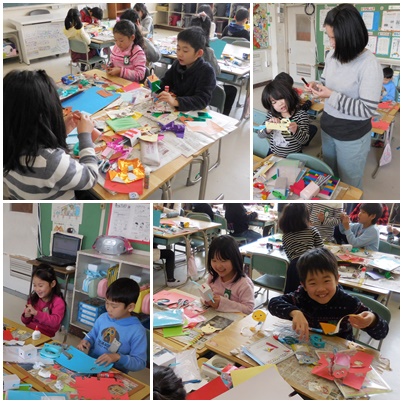 色を塗ったり色紙を貼り付けたり、楽しそうに制作しています。