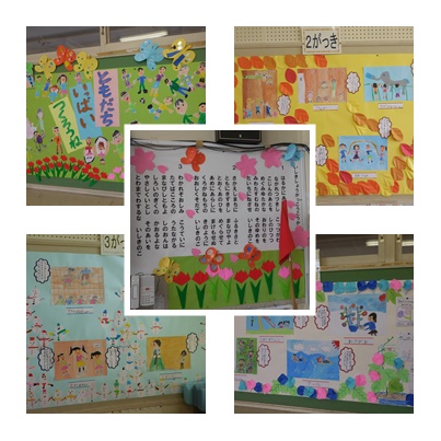 学期ごとの楽しい行事や校歌の掲示物が壁一面に貼ってあります。