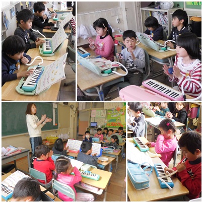 カスタネット、タンブリン、鈴、鍵盤ハーモニカを使って、「こいぬのマーチ」を演奏します。