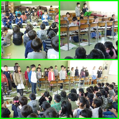 3年生の音楽です。2年生を招いて、リコーダーや鍵盤ハーモニカ、鉄琴などで合奏をして、きいてもらいました。ちょっぴり緊張しましたが、2年生が、「きれいな音でした」「上手でした」などと感想を言ってくれてうれしくなりました。