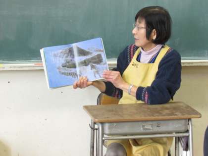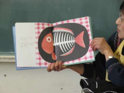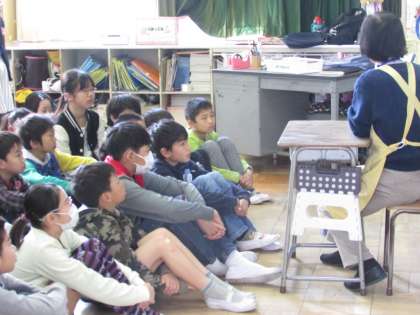 図書館司書さんによる、今年度最後の読み聞かせが4年1組で行われました。今日、お話していただいたのは、「紅玉」「ピーナッツなんきんまめらっかせい」「ほね」の3冊です。「紅玉」は、戦争が終わった年の九月、収穫間近のりんご畑がおそわれるところから、お話が始まります。北海道の自然、農民から見た戦争の姿などが描かれています。他の2冊も合わせ、興味深く聴けていました。