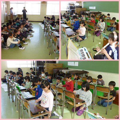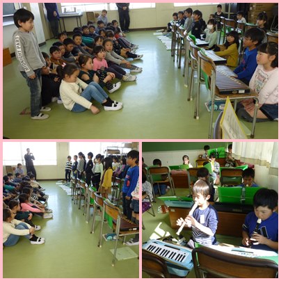3年生の演奏です。2年生を招いて合奏を発表しました。これで、3年生のどの学級も2年生の前でリコーダーを中心に合奏を発表し終わりました。どきどきしながらの発表、演奏を終えて、2年生からほめてもらえてうれしくなりました。