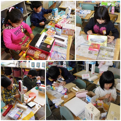 それぞれが持ってきた箱を自由に組み合わせて、つくりたい形をつくっていきます。