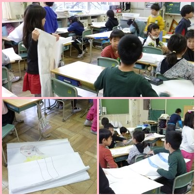 2年生の生活科「あしたへジャンプ」の学習です。自分の大きさを感じるために、ビー紙に描いた「自分」が完成しました。それを見て、大きくなった自分について、ふりかえり、3年生に向けての目当てを持ちます。