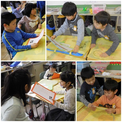 教室のあちこちで、懐かしそうに作品を眺めたり、友達と見せあいっこする姿が見られます。