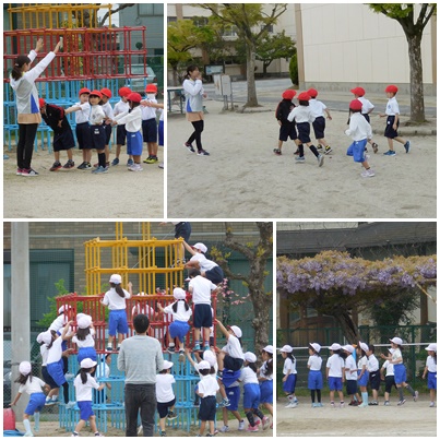 着替え方、脱いだ服の整頓の仕方などを教えてもらったら、運動場に出てぐるりと一周回ってみます。