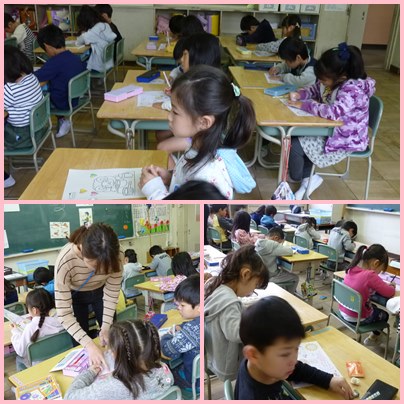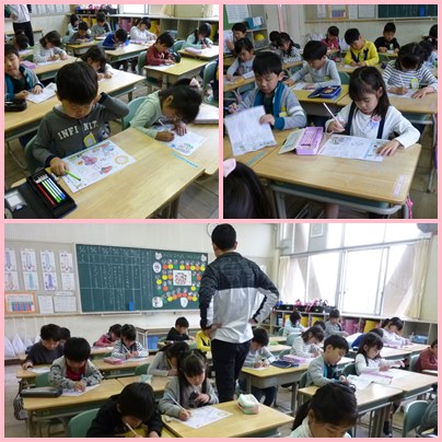 1年生の国語の学習です。まっすぐな線、くるくるまわっている線、ぐにゃぐにゃの線・・・など、丁寧になぞって書きます。