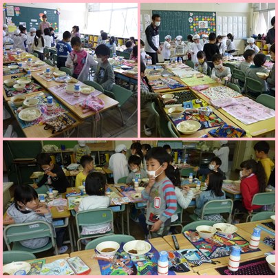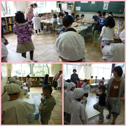 1年生にとって、はじめての給食です。今日は、カレーなので、食べやすそうです。自分たちで配膳して、いただきます。食器の置き方や、牛乳のふたの取り方など、しっかり話を聞いて、おいしく食べます。