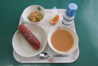 新たまねぎ入り豚汁、まぐろスティック、牛乳、