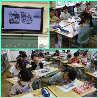 2年生の国語「かんじのひろば」の学習です。習った漢字を使って、島の様子の説明文を書きます。テレビで、大きく映された島の様子から確認をして、文を書きます。その後、グループで紹介しあいます。