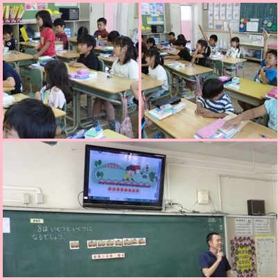 1年生の算数「いくつといくつ」の学習です。「8は、いくつといくつかな」というめあてで数の分解について学びます。テレビ画面に映し出された絵をヒントに考えます。