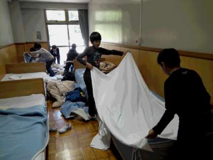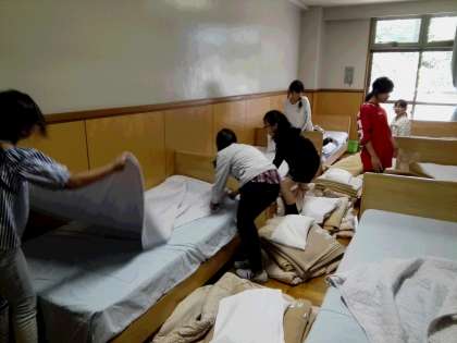 みんな悪戦苦闘しながらベッドメイキングをしています。