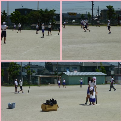 6年生の体育「ボール運動」の学習です。ティーボールのルールについて確認し、チーム対抗の試合を楽しみます。