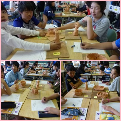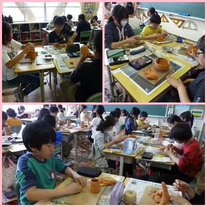 6年生の図工「はにわつくり」です。粘土で埴輪つくりをしました。弥生時代の人の気持ちになって、工夫してつくり、できあがったらお互いに鑑賞します。