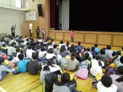 雨は小降りになっていますが、運動場がぬかるんでいるので、体育館で解団式を行いました。