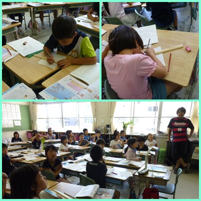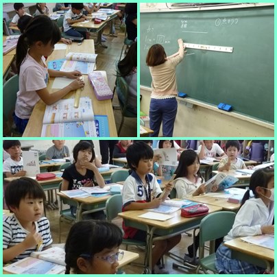 2年生の算数「長さ」の学習です。ものさしの使い方を学び、実際に7センチメートルの長さを書きます。確認しながら、正しく書いています。