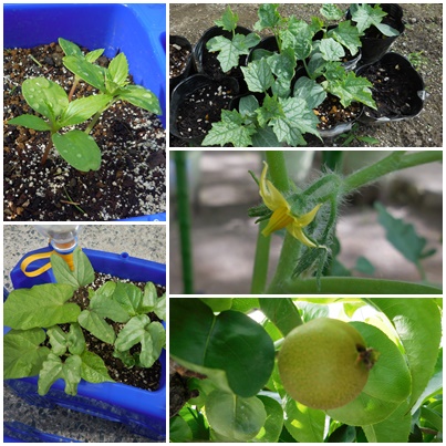 アサガオ、ホウセンカ、ヘチマは大きな本葉を広げ、トマトは早くも花を咲かせています。