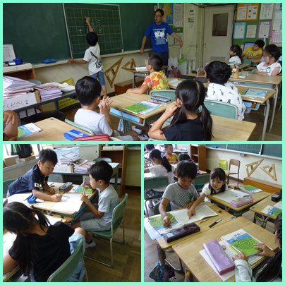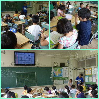 3年生の算数「くり上がりが2回ある筆算をしよう」の学習です。一の位と十の位にくり上がりがあります。くり上がりを忘れないように筆算の中に書き入れます。書画カメラを使って解き方の説明もします。