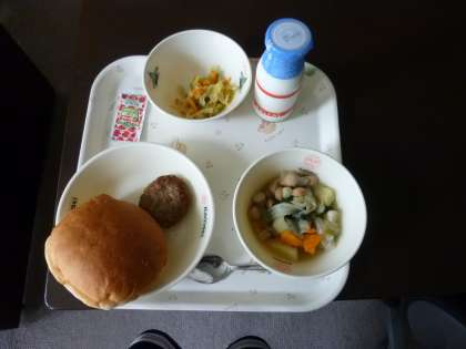 牛乳 サンドイッチバンズパン じゃがいものポトフ ハンバーグ 野菜のソテー
