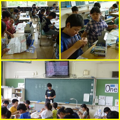 4年生の理科「電気のはたらき」の学習です。乾電池とモーターでの自動車作りや光電池を使ってモーターを回し、電気の働きを調べていきます。今日は、まず、実験道具の組み立てです。協力しあって作っています。