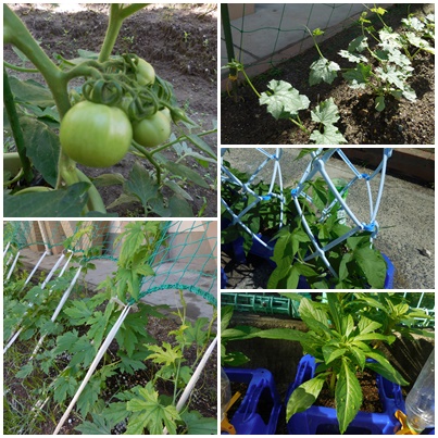 4年生が育てているヘチマ、1年生が育てているアサガオ、緑のカーテンとして育てているゴーヤはつるを伸ばして支柱や網にそって育ちはじめています。