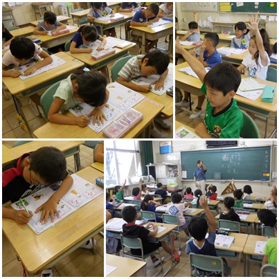 子どもたちは書き始める前の、その文字がつく言葉を発表する時間が大好きです。