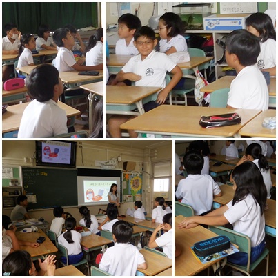 今日は5年生が発育測定を行っていますが、保健室で身長や体重を測る前に、教室で「けがの防止と手当」について養護教諭の先生の授業を受けています。