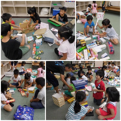 家から持ち寄ったり、先生が用意してくれた箱をたくさん集めて、グループで作品をつくります。