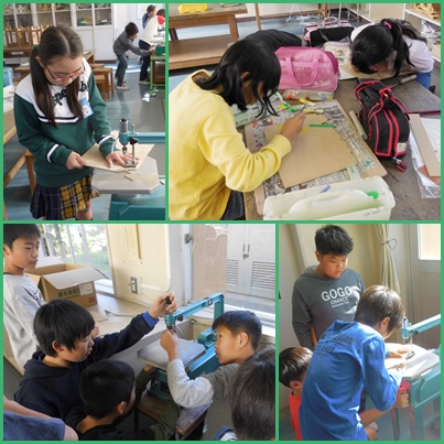 板材を電動糸のこぎりで切り、伝言板を制作しています。