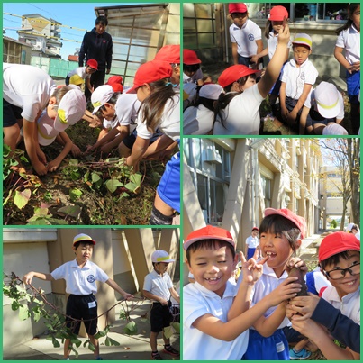 今日は、今年何年か振りに使ってみた1年教室前の学年園に植えたものを収穫しました。