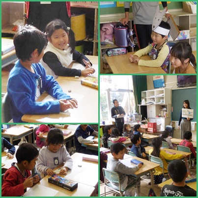 オオカミのお面を頭にかぶったり、ウサギのぬいぐるみを抱いたりしながら、オオカミの気持ちにそって考えます。