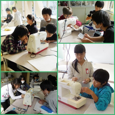 5年生の時に学習したミシンの使い方を思い出し、友だちと教えあいながら作業を進めています。