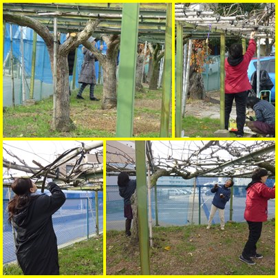昨日、梨の枝の剪定をやっていただいたので、今日は、梨ボランティアさんに、薬剤塗布を行っていただきました。切り口に薬をぬって、虫が入ったり腐ったりしないようにするためです。ボランティアのみなさん、寒い中、ありがとうございました。