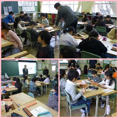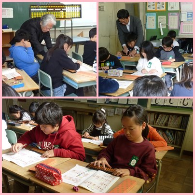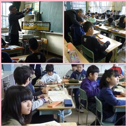 3年生は、珠算連盟の先生を講師にお招きして珠算教室を行いました。そろばんの各場所の名前、一だま、五だまの意味、たし算・・・など、順番に教えていただきました。