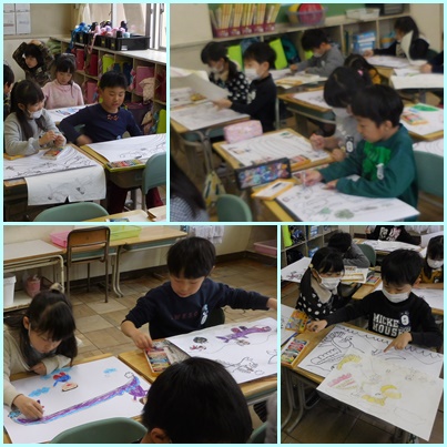 恐竜やチョウチョ、思い思いに乗ってみたいものを想像して、友だちに一生懸命説明しながら描いています。