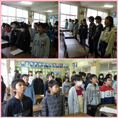 6年生の音楽の学習です。音楽で習った歌、卒業式で歌う歌、今月の歌で歌った歌・・・・・気持ちをこめて、友達の歌声を聞きながらしっかり合唱します。