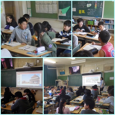 弥生時代のむらの様子を描いたイラストを見ながら、どんな特徴があるのか、何のための建物なのかなどを考えています。