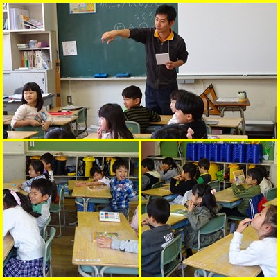 1年生です。学級目標の掲示物を作ります。「にこにこ」ってどんな顔?お互いににこにこの顔を見合っています。そういうにこにこの顔をかいて掲示にしていきます。