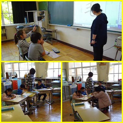 コスモスの学習です。ひらがなや漢字、日本語について学びまうs。ボランティアさんにもお助けいただいています。