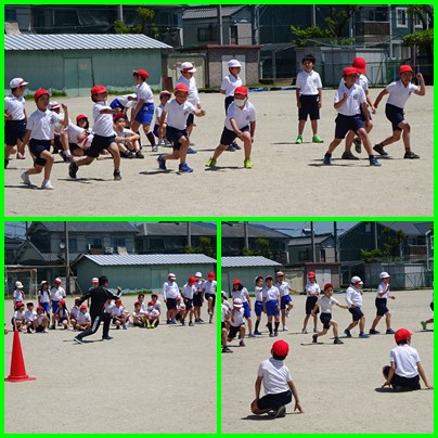4年生の体育「陸上運動」の学習です。「走る」動きについて学びます。手・足・体・・それぞれの部分をどのように動かすのかを、スローモーションのように動いて確かめます。