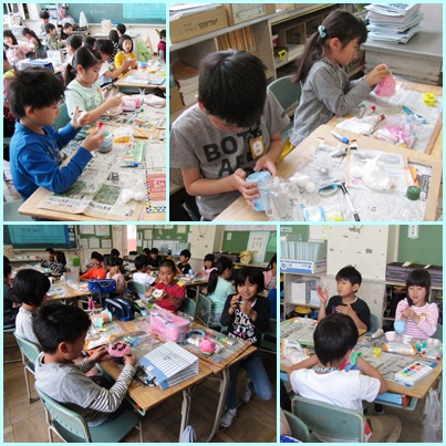 空き容器に紙粘土をつけて、生活の中で使うものをつくります。