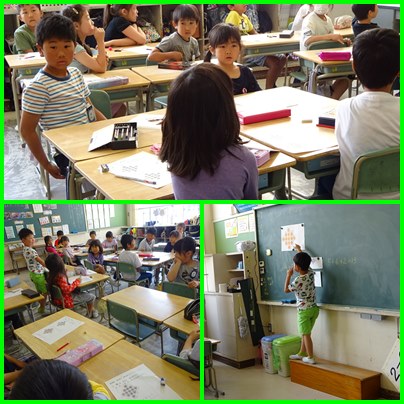 2年生の算数「まなびを いかそう」の学習です。数図ブロックの数を求める式をいろいろ考え話し合い、話し合いの仕方を知ります。どのように考えて式に表したのか、図を使って説明します。
