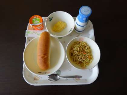 牛乳 小型ロールパン 塩焼きそば オムレツ 野菜ゼリー