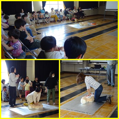 5月11日(土)午後1時半より、PTA主催で「親と子のつどい」を行いました。消防署の方を講師としてお招きし、呼吸や心臓が停止した人の応急手当として、AEDや胸骨圧迫の体験をしたり、救急講話を聞いたりしました。