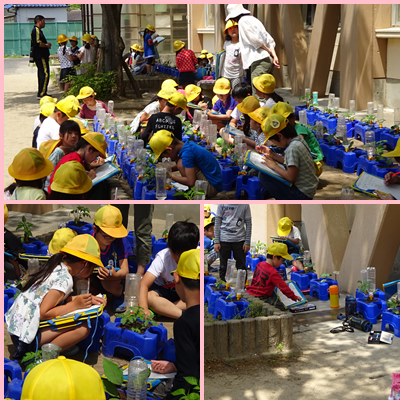 2年生の生活科「野菜の苗を観察しよう」の学習です。このまえ植えた野菜の苗を観察しています。「葉っぱが増えたよ。」「背がのびたよ。」など、この前からの変化に気づいて観察しています。